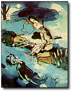 On display in this hall is the Jason Jagel painting, Murder Ballad from the Yerba Buena Gardens show Bay Area Now. San Fransisco Chronicle art critic Kenneth Baker, had this to say: "Jason Jagel's paintings and drawings also may put some people off. Their cartoonish melodramas seem to evoke a child's struggles with the conflict between fantasy and conscience. Or maybe adult struggles with childish impulses." "More likely an obsession with Nick Cave and the Bad Seeds," Marc said while he dropped this by. Thanks Marc! |
